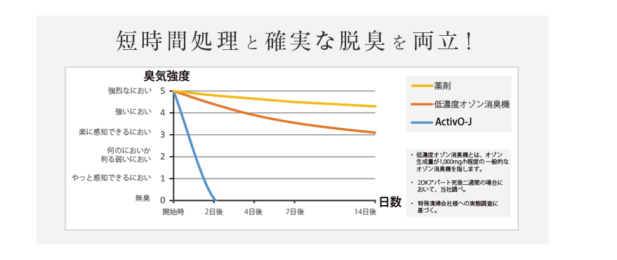 2週間経っても残ってしまう臭いを、2日で無臭の状態まで実現することができます。