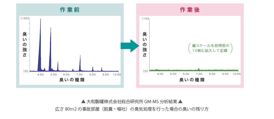 強い臭気まで完璧に脱臭し、無臭空間の再現が可能です