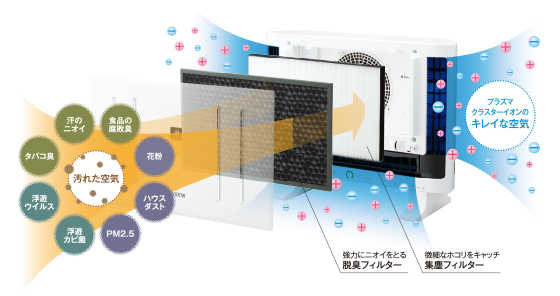 | 適用床面積(目安) | 空気清浄機能:~70m2(約42畳)※1 高濃度プラズマクラスター25000:~35m2(約21畳)※3 |